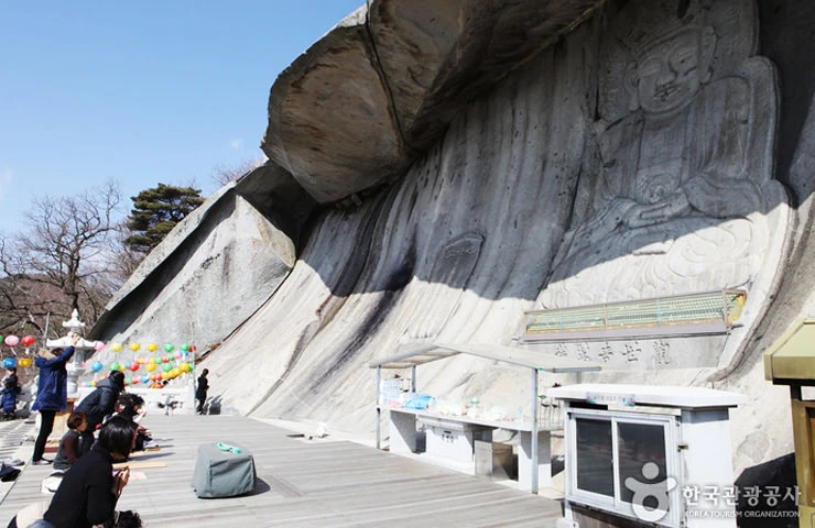 새벽 동틀 무렵에 듣는 절 앞바다의 파도 소리와 눈썹바위의 마애관음보살상은 예로부터 내려오는 강화 8경에 드는 명승지로 꼽혔다. 번잡한 도심을 벗어나 서해바다의 비릿한 냄새를 머금은 바람을 맞으며 보문사에 오르면, 인천시기념물 17호로 지정된 수령 약 600여 년이나 된 향나무가 절 마당에 늘 은은한 향을 머금고 있다. 향나무 뒤에는 어부가 건져 올렸다는 전설이 있는 23나한님이 모셔져 있는 자연석으로 되어있는 거대한 석실이 있다. 눈썹바위의 마애석불은 절마당에서 약 8분 정도 올라가면, 서해 바다의 경치와 시간이 맞는다면 석양까지 볼 수 있다. 출처 : 대한민국구석구석(korean.visitkorea.or.kr) → 펜션에서 약 23.38km 자동차로 약 37분